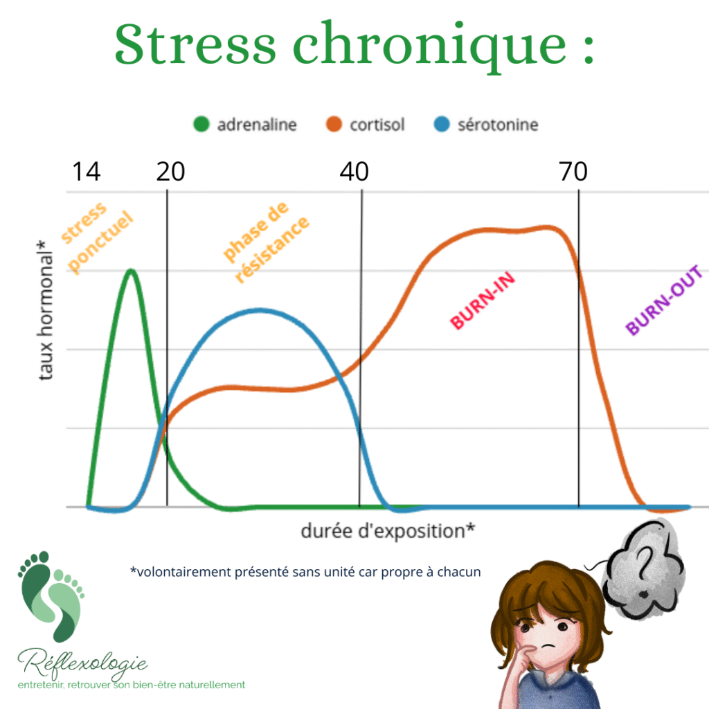 Au fur est à mesure de l’exposition au stress répété, chronique, notre corps entre en adaptation constante. Cela peut modifier nos hormones présentes et entraine beaucoup de perturbations physiologiques, mentales et émotionnelles.